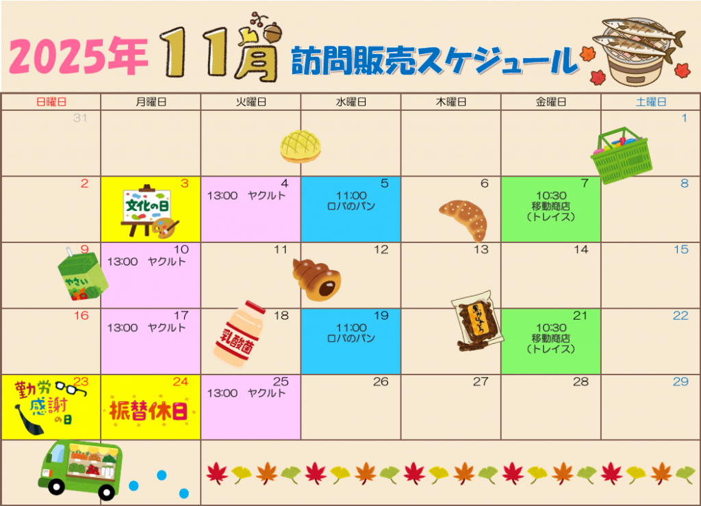 2025年11月の訪問販売について🛒 投稿日時:2025年10月28日 2025年11月の訪問販売スケジュールです。 どなたでもご利用できますので、お気軽にお越しください✨ カレンダーをクリックすると印刷画面が開きます