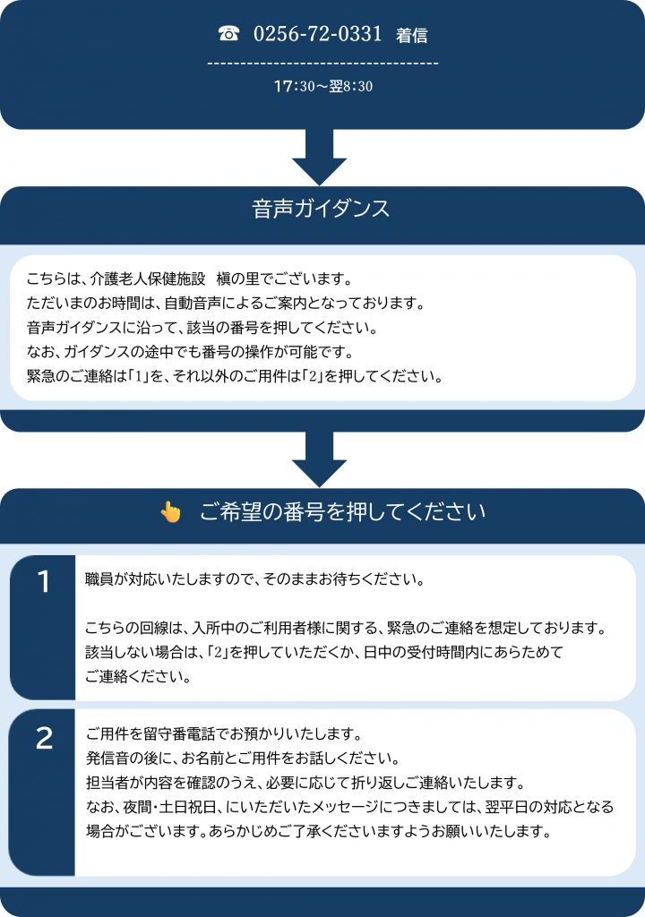 当施設では、夜間(17:30~翌8:30)のお電話を音声ガイダンスでご案内しております。