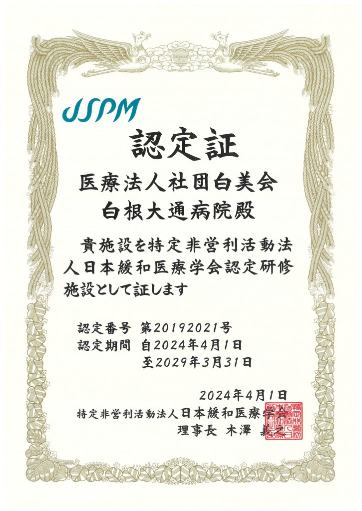 2019年4月より『日本緩和医療学会認定研修施設』に認定されています。 2019年4月より、『日本緩和医療学会認定研修施設』に認定されています。 研修施設として、今後も緩和ケアの質の向上に努め、患者様・ご家族により良い医療とケアを提供していきます。
