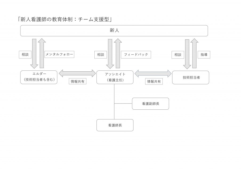 当院はチーム支援型で指導しています。 チーム支援型とは、同じ職場【チーム】みんなで、新人看護師を育成する教育体制です。  主にエルダー看護師の役割を担った看護教育者が指導に当たりますが、すべてのスタッ フが関わることを基本としています。