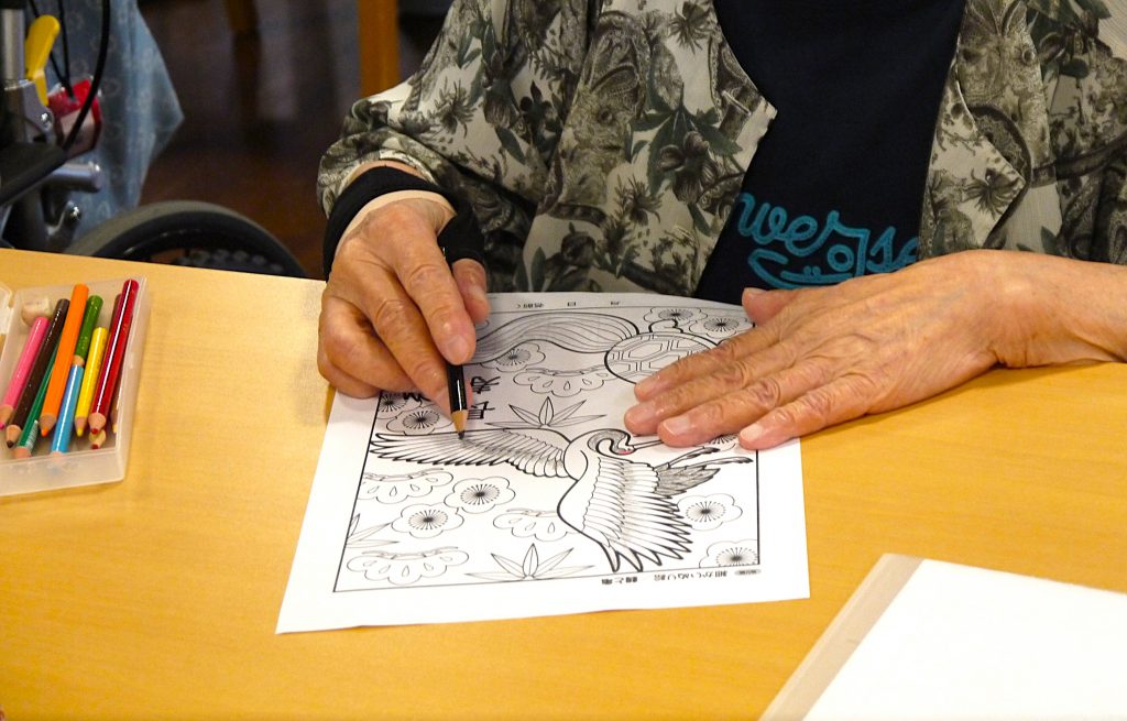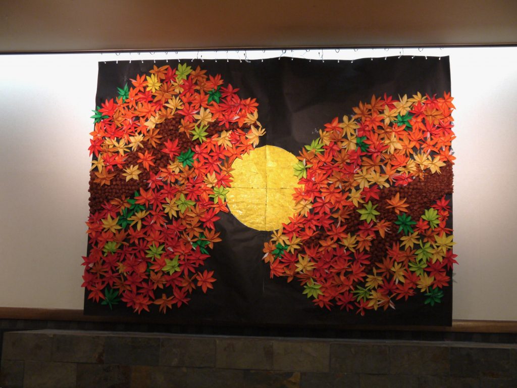 リハビリや入浴の間の空いた時間は、ラジオ体操や塗り絵、間違い探しなどの頭を使うプリントもあるのでそちら解いたり、新聞や雑誌も置いてあるので皆様好きな時間を過ごされております。午後はレクリエーションになります。運動レクでは、身体を使ったどなたでも楽しめるレクを用意しています。手作業レクレーションでは、季節ごとの壁画を皆様に制作していただいてます。毎月、とても素敵な作品が完成しています。