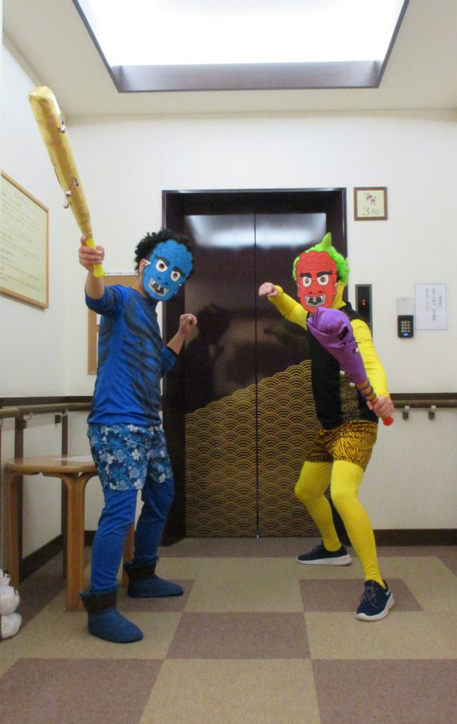 節分行事当日は、職員が鬼役となり登場すると、驚いた表情を見せながらも、すぐに笑顔が広がりました。利用者様の元気な掛け声と笑い声が施設内に響き渡り、豆に見立てたボールを鬼へ向かって力強く投げつける方、優しく豆を渡そうとする方、それぞれの個性あふれる場面が見られました。